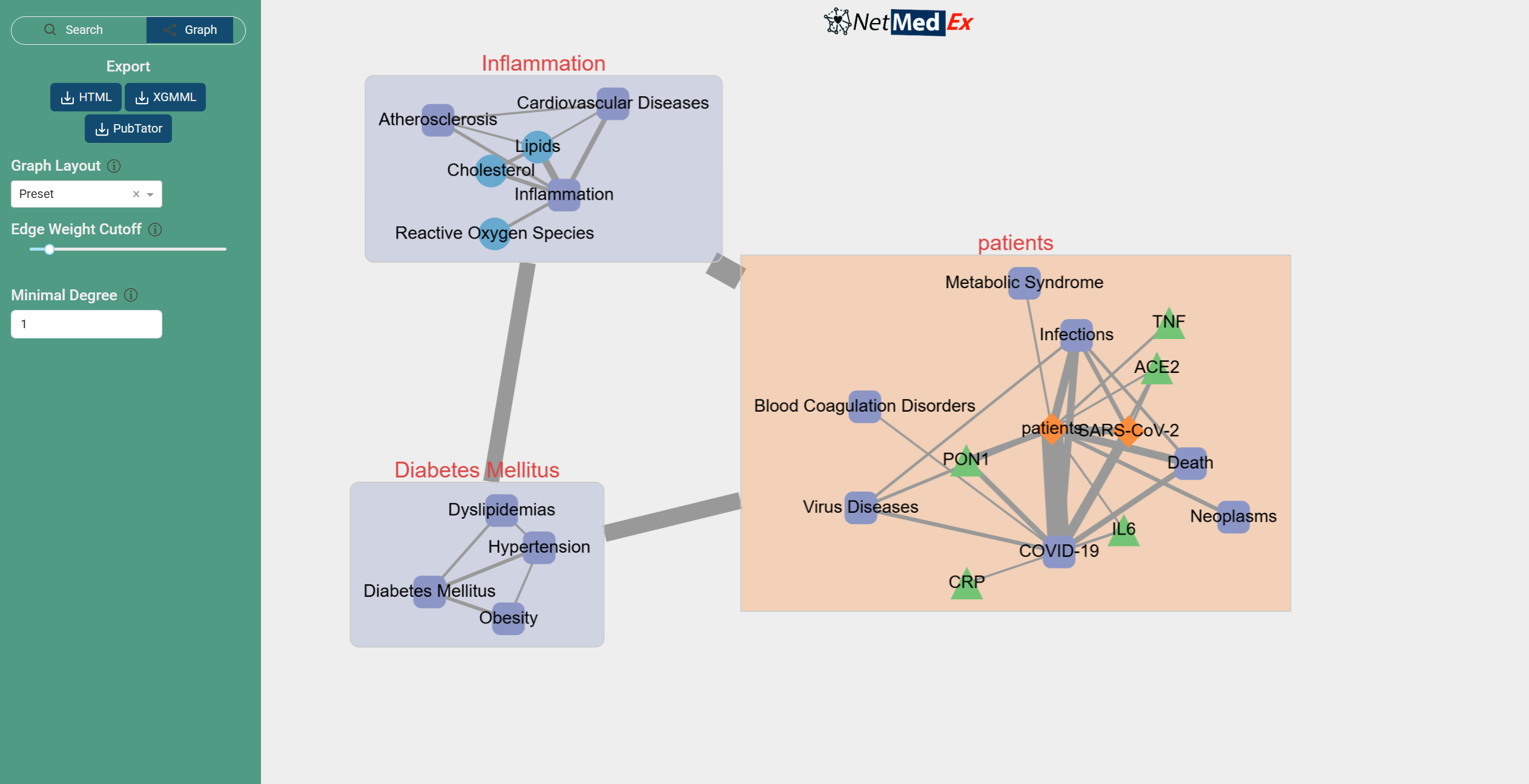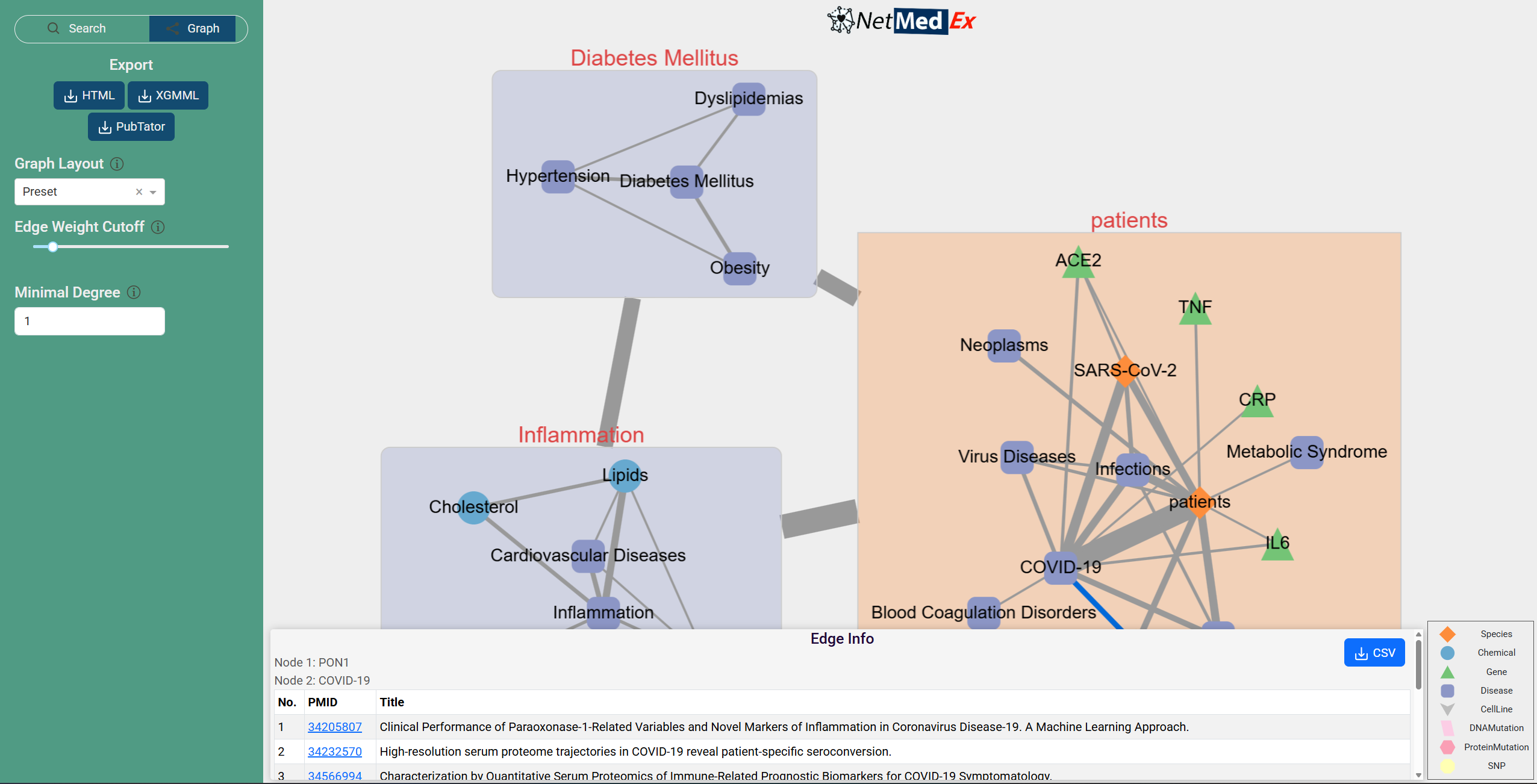 PubTator: Download the corresponding PubTator file for reuse (see Generate Networks from PubTator Files).HTML: Export the network in HTML format.XGMML: Export the network in a Cytoscape-compatible format (see Network Output Format).