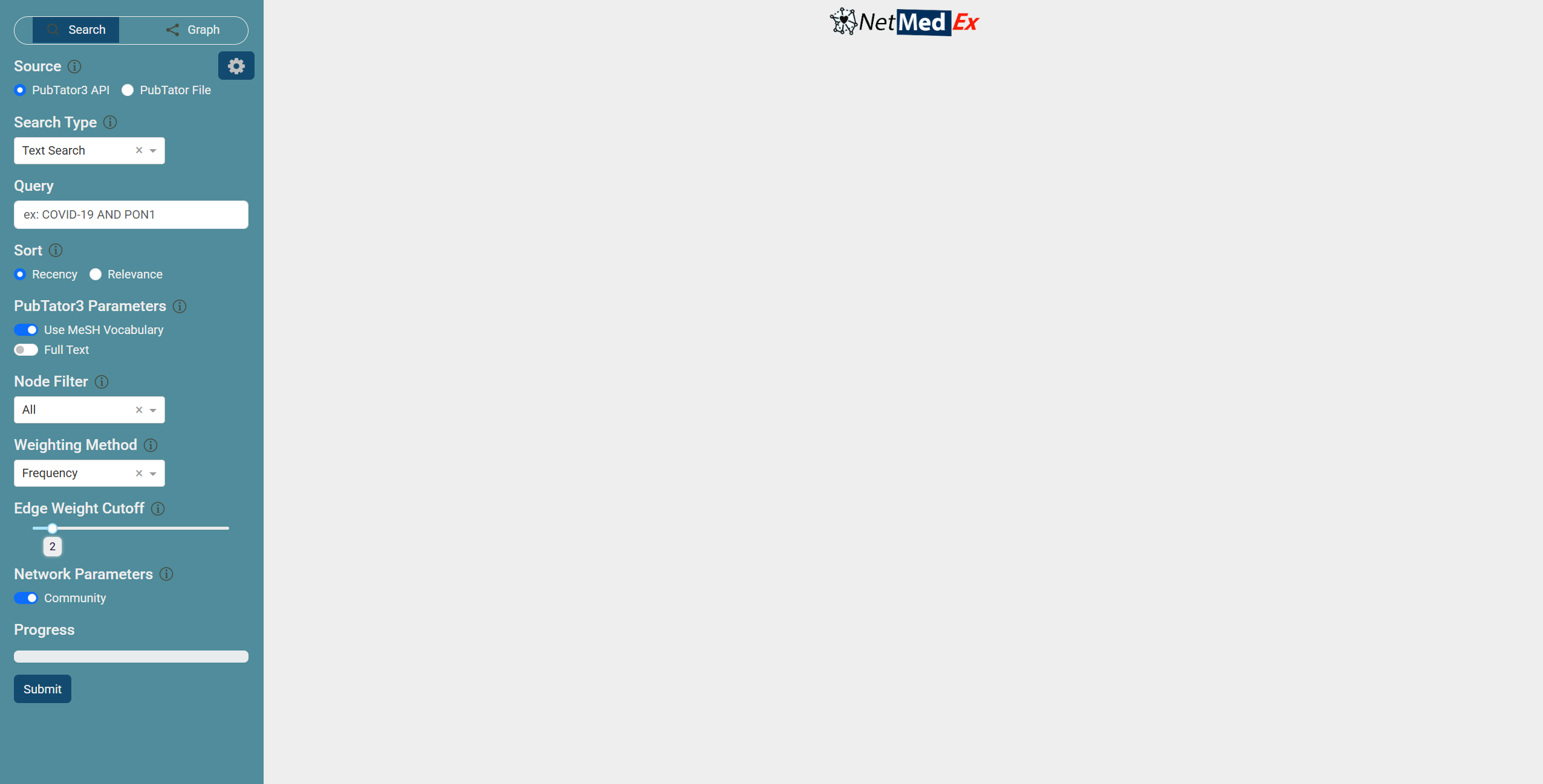 This is the typical interface when you open the app in your browser (NetMedEx v0.3.0).